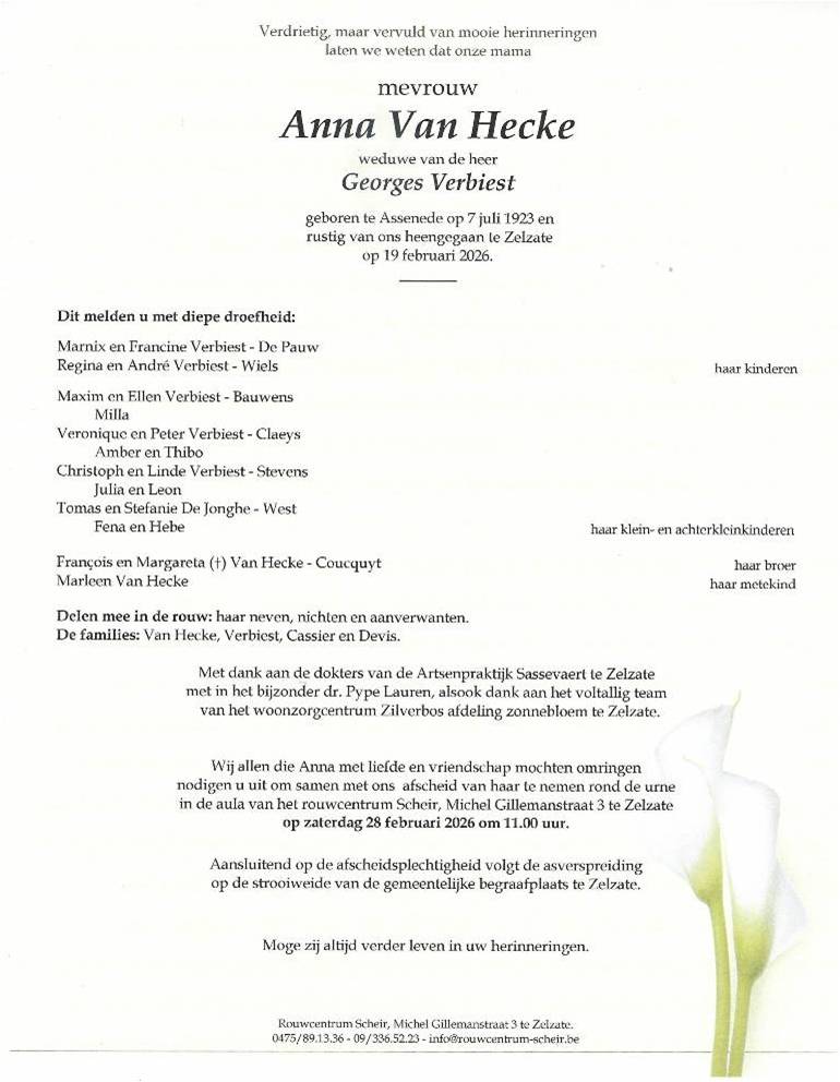 Oprechte deelneming bij het overlijden van Anneke Verbiest. 102j. Heel veel sterkte in deze trieste periode.